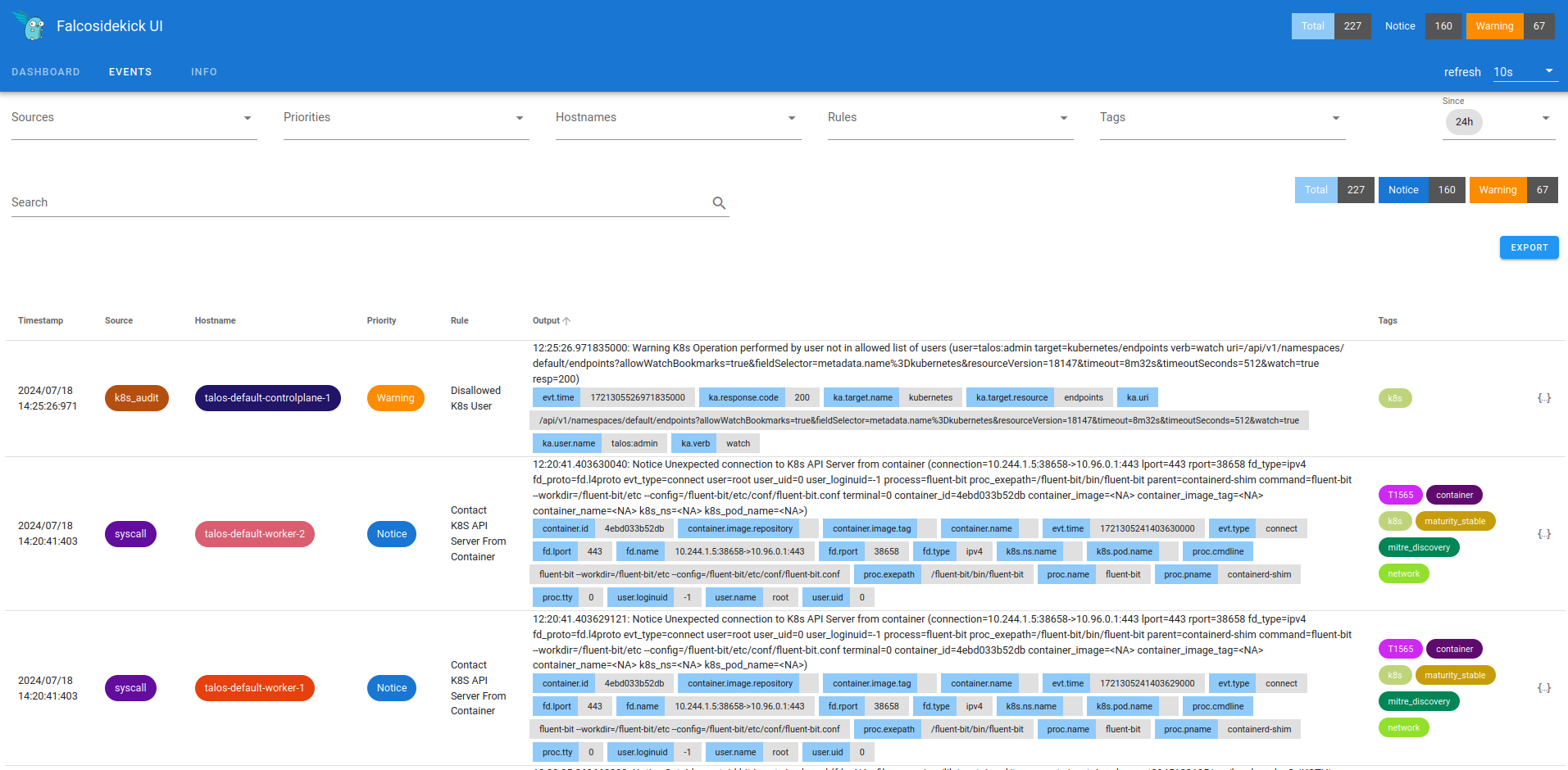 Everything should be set up and running from now. You can access to the Falcosidekick-UI by the URL http://10.5.0.2:30128.