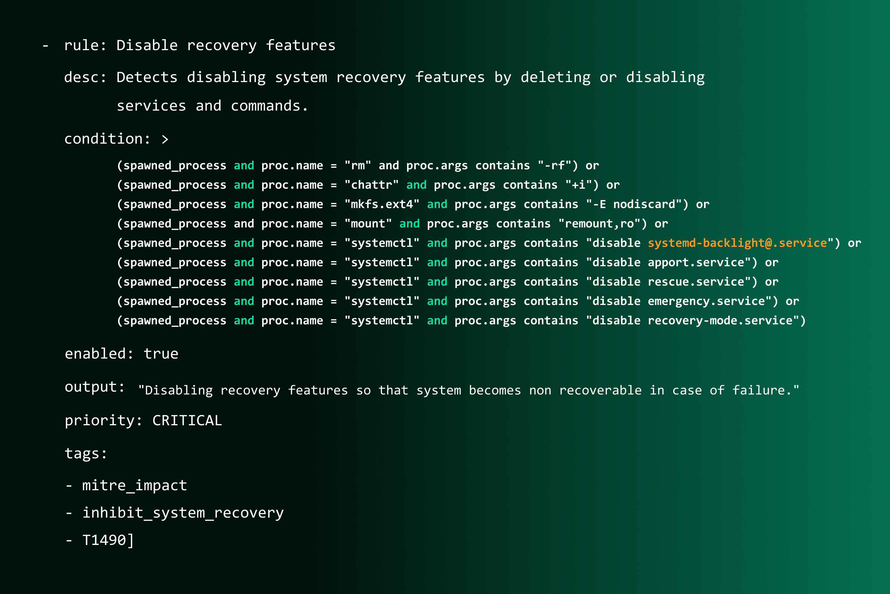 Rule Name: We need to first decide name of our rule, since we wrote a rule specific to an ATT&CK technique, let’s keep it similar:rule: Disable recovery features.