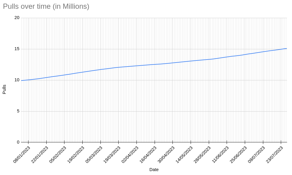 The number of pulls of the official Falcosidekick image from Docker Hub has also just reached 15M, which we consider mind-blowing. It took it 3 years to reach the first 5M pulls and now it's needed less than six months to do it again. Awesome!