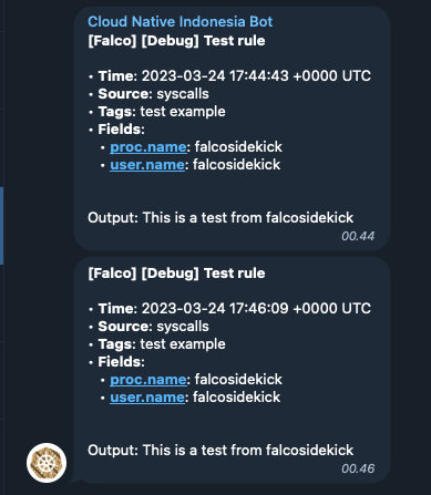 Telegram, the instant messaging platform, is becoming more and more used by companies for notifications, and thanks to zufardhiyaulhaq, it can receive Falco alerts too.