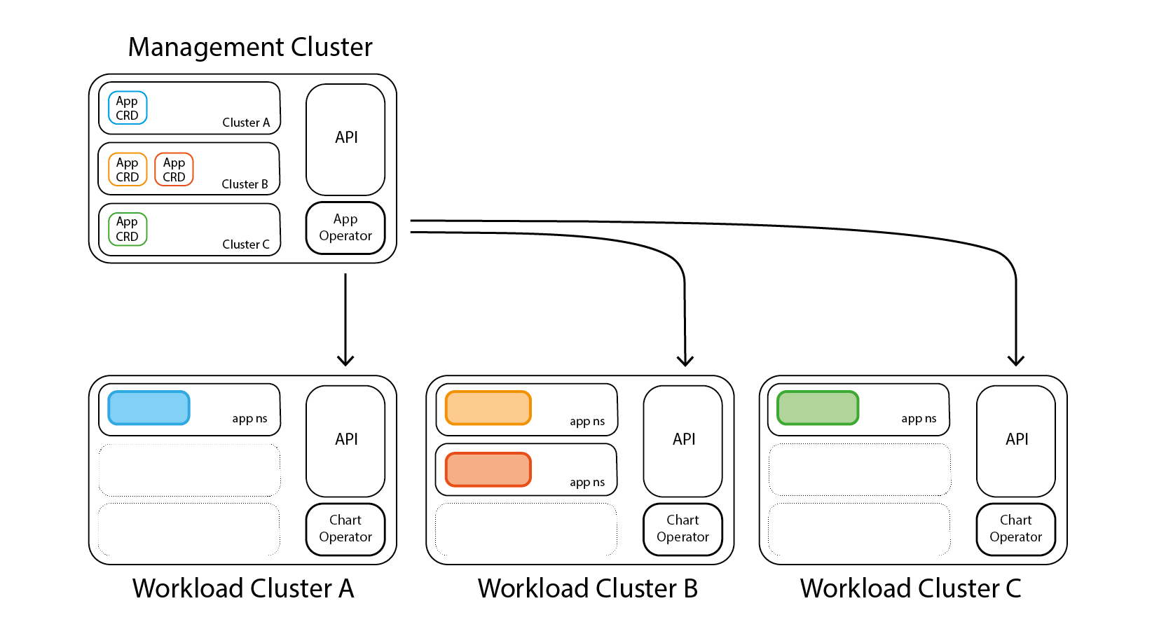 The technology behind it is simple: Apps are packaged as Helm charts, can be configured with values, overridden with a different app configuration, etc. - whatever meets your needs. To deploy, a CRD (Custom Resource Definition) resource is created, interpreted by the App Operator (running on the managed cluster), assigned to the Chart Operator (running on the workload cluster), and in a few seconds, our application will be deployed on as many clusters as desired.