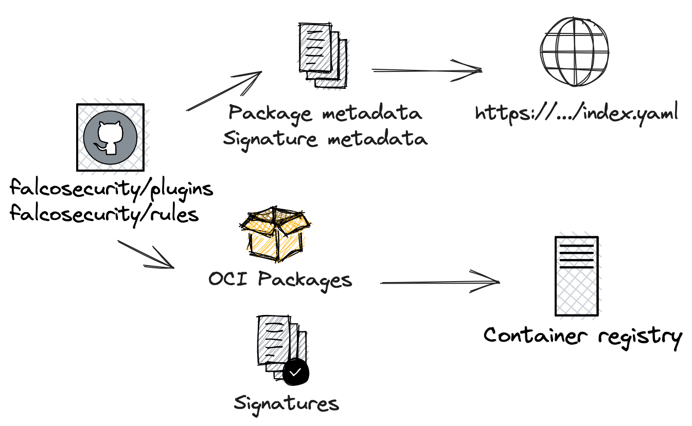 The latest stable Falco release, v0.36.0, alongside falcoctl 0.6.1 and the 0.7.0 Helm chart introduced new features and improvements to the security of Falco's software supply chain artifacts. Falco's two main downloadable artifacts are plugins and rule sets. They're shipped in the OCI specification format and distributed through the official Falcosecurity OCI repositories.