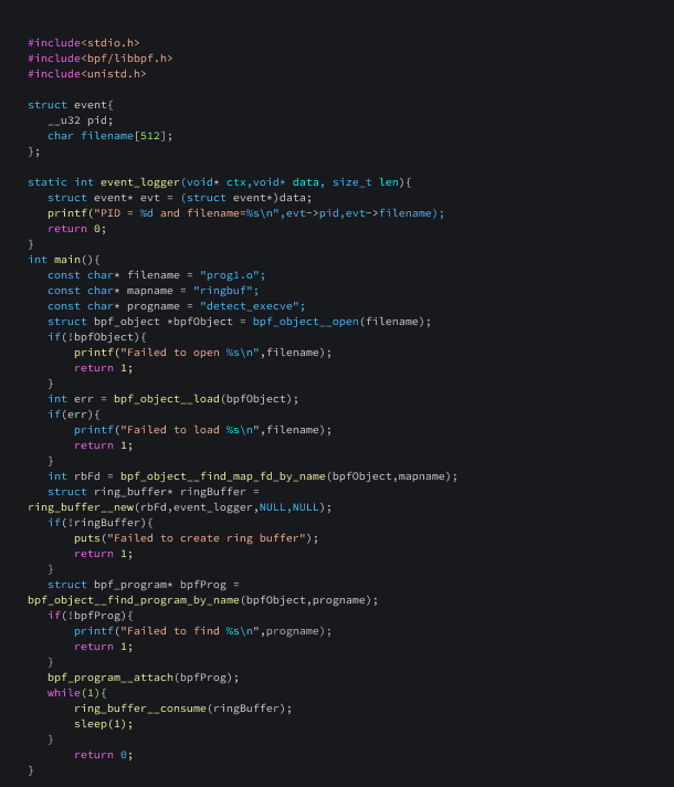 Now, we need to write a loader program that loads and attaches this program. This loader program is used to load and attach an eBPF program to the Linux kernel. It opens and loads the eBPF object file, checks for errors during the process, finds a specific eBPF program within the loaded object, and attaches it to the kernel. Once attached, the eBPF program will be executed when certain events occur. The program enters an infinite loop at the end, indicating that it will continue running until it is manually terminated.